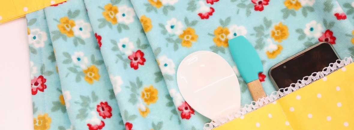 A special thank you to my Aunt for giving me the idea for today’s project! This is a cute little apron made from a dish towel. It’s pretty fast to make and doesn’t take a lot of fabric. It is a good way to practice sewing pleats and pockets.