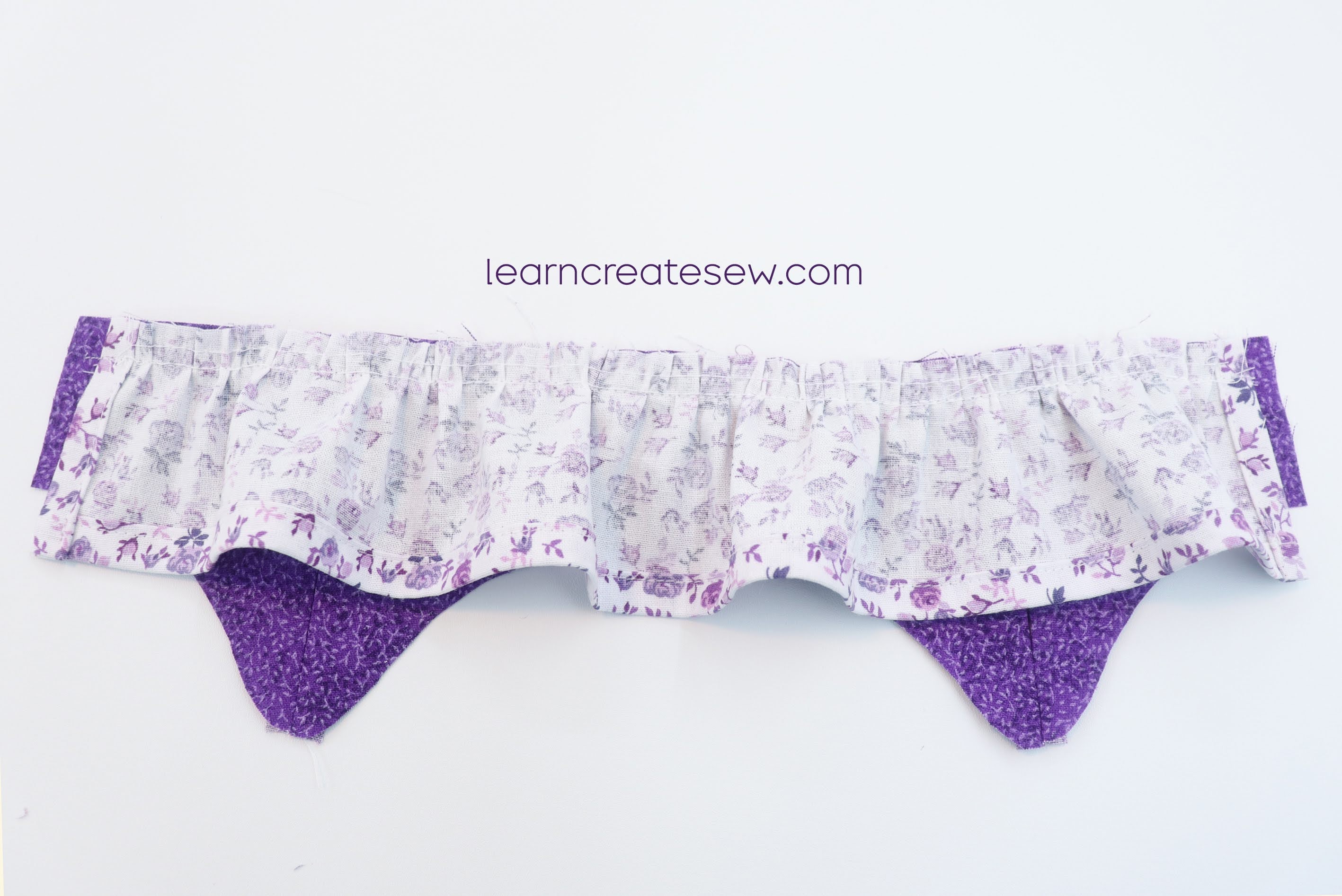 Lay the bodice with the bottom edge flat (the one you did not press) right side up. Place the skirt right side down on top of it. Align the gathered edge of the skirt with the raw edge of the bodice. Let the bodice extend an extra 1/4 inch on each side beyond the skirt. Stitch the skirt in place along the gathered edge with a 1/2 inch seam allowance.
